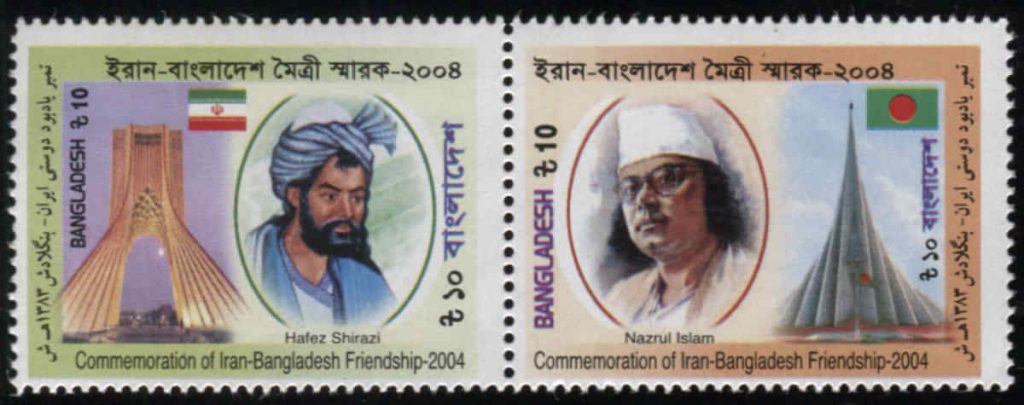 কাজী নজরুল ইসলাম স্কুলজীবন শেষ না করেই সৈনিক জীবন বেছে নিয়েছিলেন। প্রথম বিশ্বযুদ্ধ চলাকালে প্রায় ৩০ মাস তিনি বাঙালি পল্টনের সঙ্গে করাচিতে অবস্থান করেছেন। তখন তিনি ফারসি ভাষা সাহিত্যে জ্ঞান লাভ করেন। পরবর্তীকালে ফারসি কবিতার প্রতি কবির অনুরাগের বহু নমুনা আমরা খুঁজে পাই তাঁর অনেক কবিতা ও সংগীতে। ফারসি ভাষা-সাহিত্যের লীলাভূমি সাবেক পারস্য যা বর্তমানে ইরান নামে পরিচিত। ২০০৪ সালের ৩ জুন ইরান-বাংলাদেশের বন্ধুত্ব উপলক্ষে প্রকাশিত ১০ টাকা মূল্যের দুটি আলাদা ডাকটিকিটে তাই প্রাসঙ্গিকভাবেই স্থান পেয়েছেন পারস্যের কবি হাফিজ সিরাজী ও বাংলাদেশের কাজী নজরুল ইসলাম।
